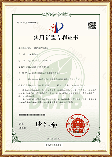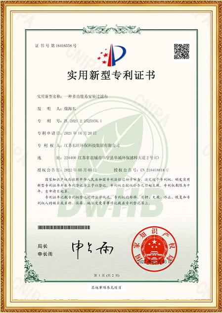 Compania noastră are o putere economică puternică, o echipă tehnică profesională, echipamente avansate de producție și o asigurare de bună calitate a instrumentelor de testare. The company 1st passed ISO9001-2008 Quality System Certification in the industry, and obtained National Environmental Label Product Certification in 2015. It was approved as National high-tech enterprise in 2019, obtained the certificate of Yancheng Environmental Protection Engineering Technology Research Center in 2021, Dongwang was rated as a specialized and special new enterprise in Jiangsu Province in 2023, and has more than 10 national patents. Este unul dintre întreprinderile de filtrare a protecției mediului desemnate din provincia Jiangsu.